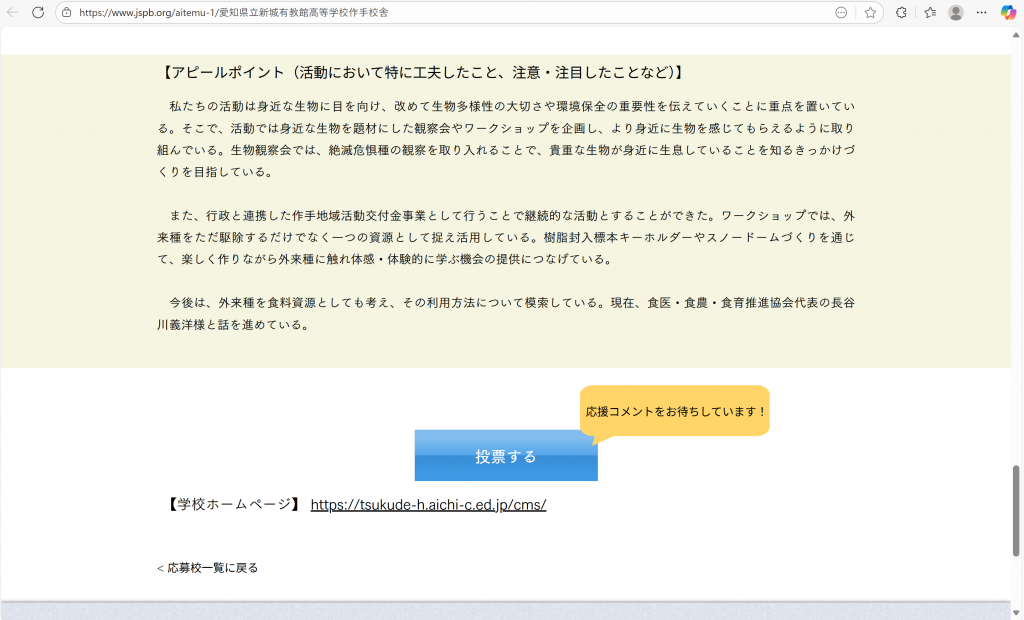 投票数が審査結果の参考となります。また、これまで活動を続けてきた生徒と教員の励みになりますので、いいね!と感じたら投票をお願いいたします!!(10月17日まで投票受付中)