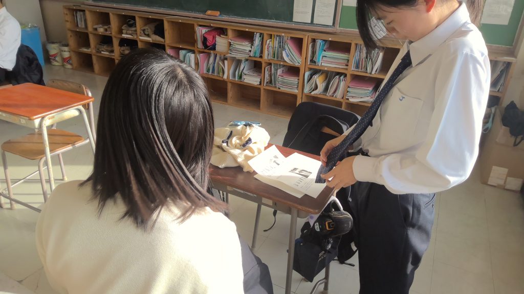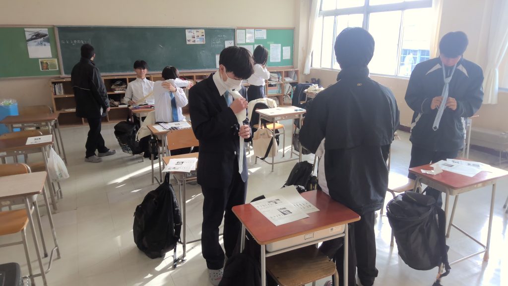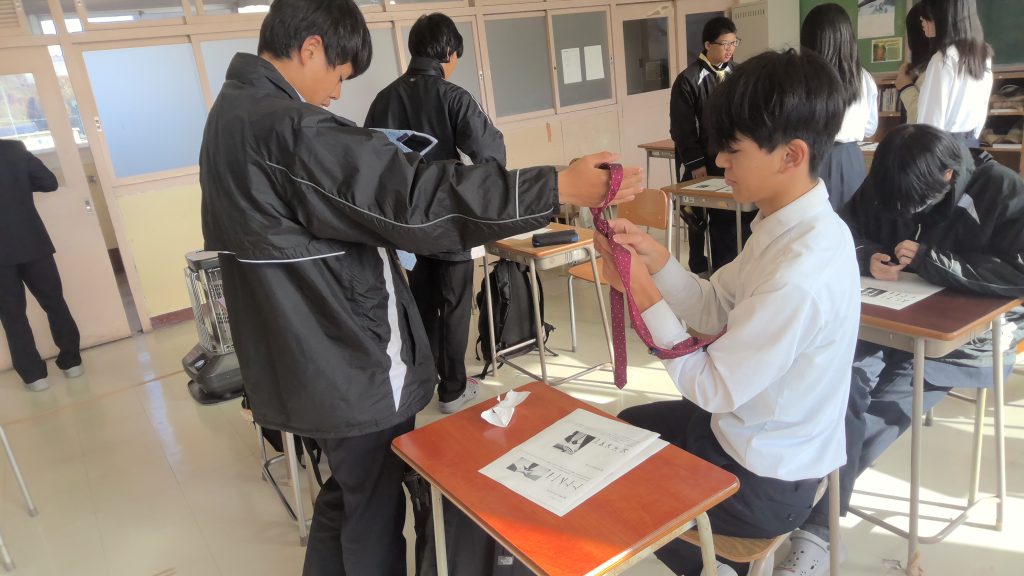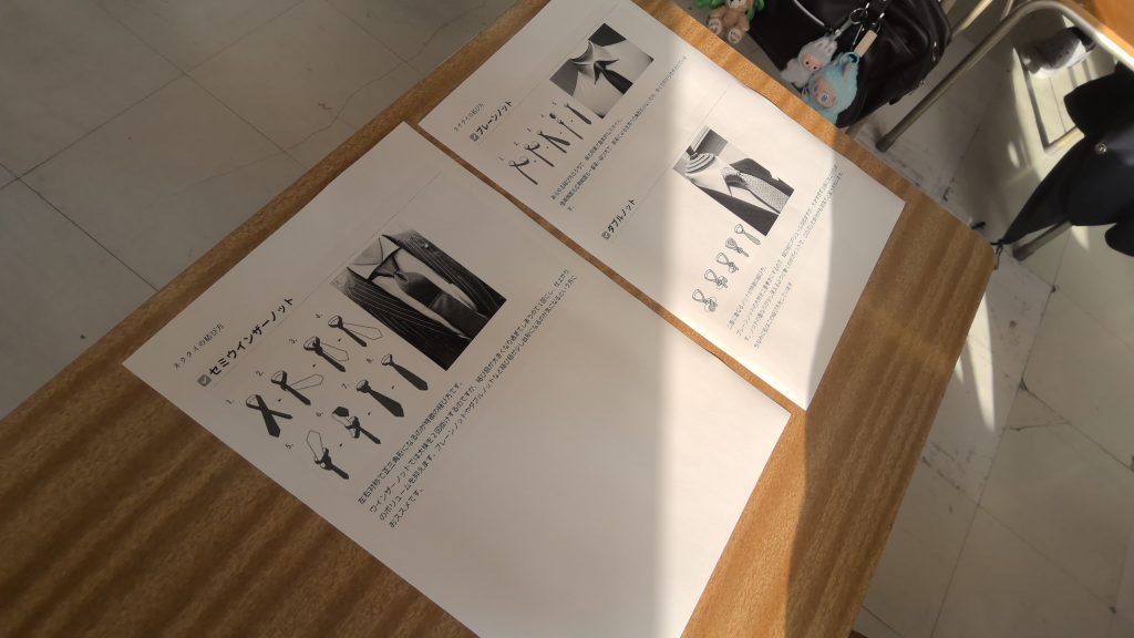 プレーンノット、ダブルノット、セミウインザーノットの3種類を教えましたが、聞こえてくるのは「わからん!」や「バランスが悪くなる!」などの阿鼻叫喚。