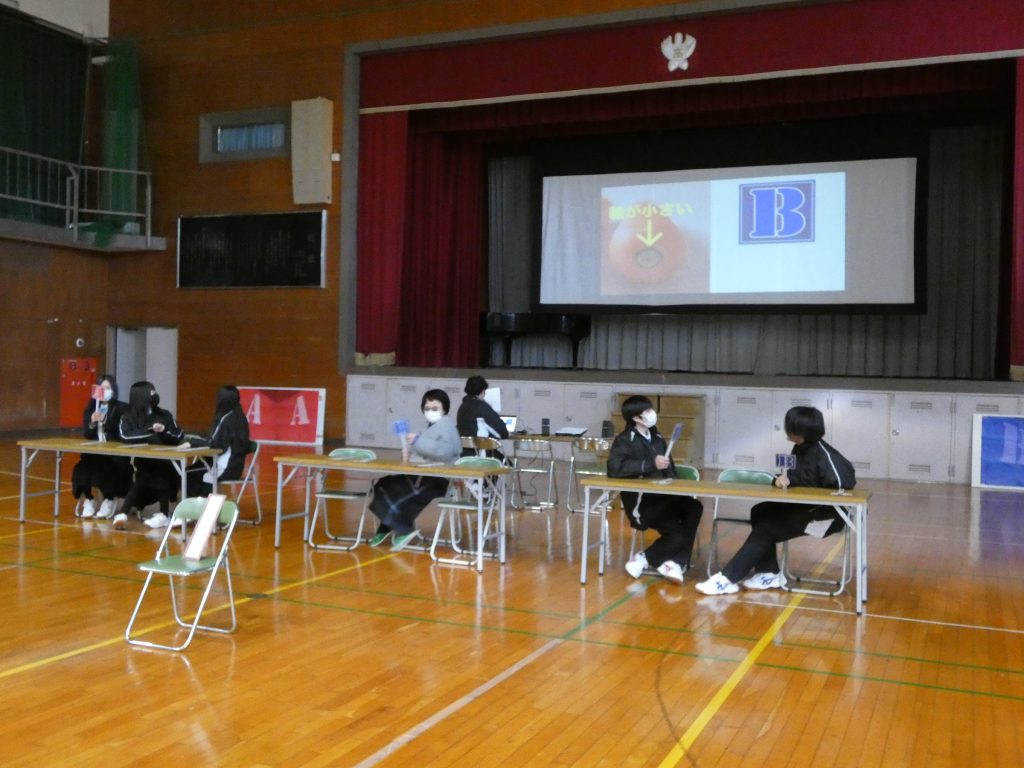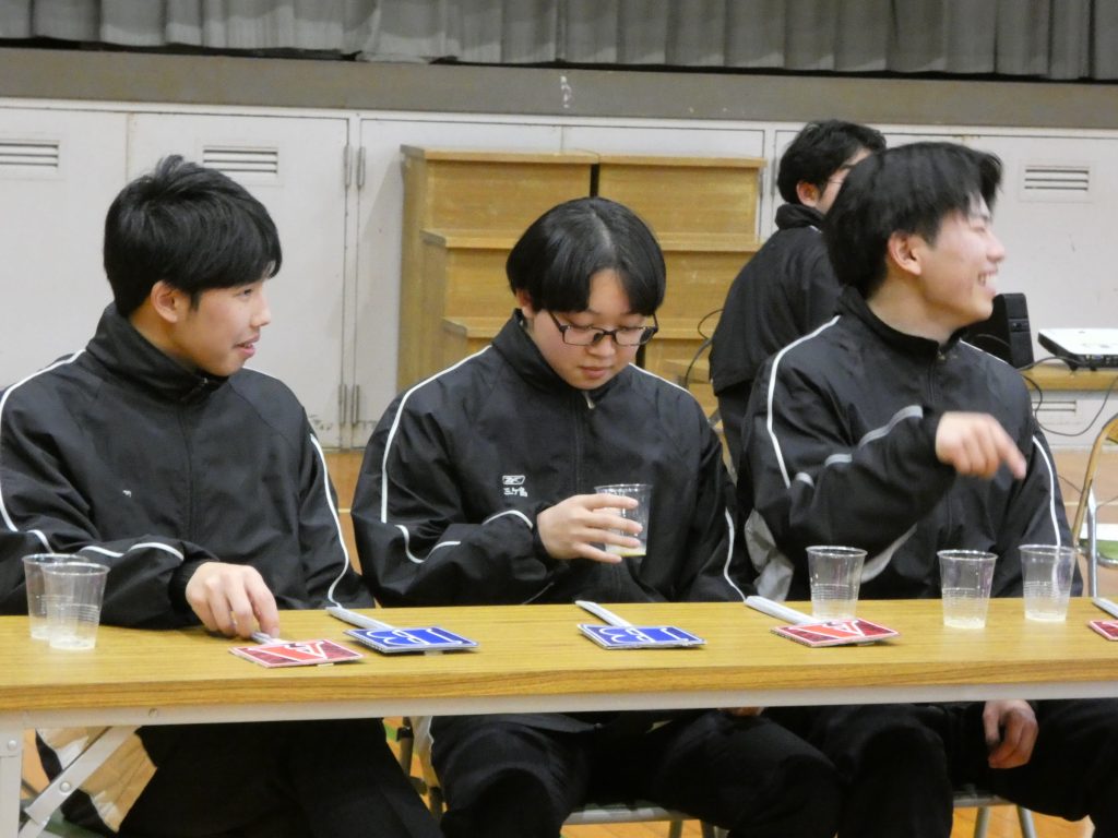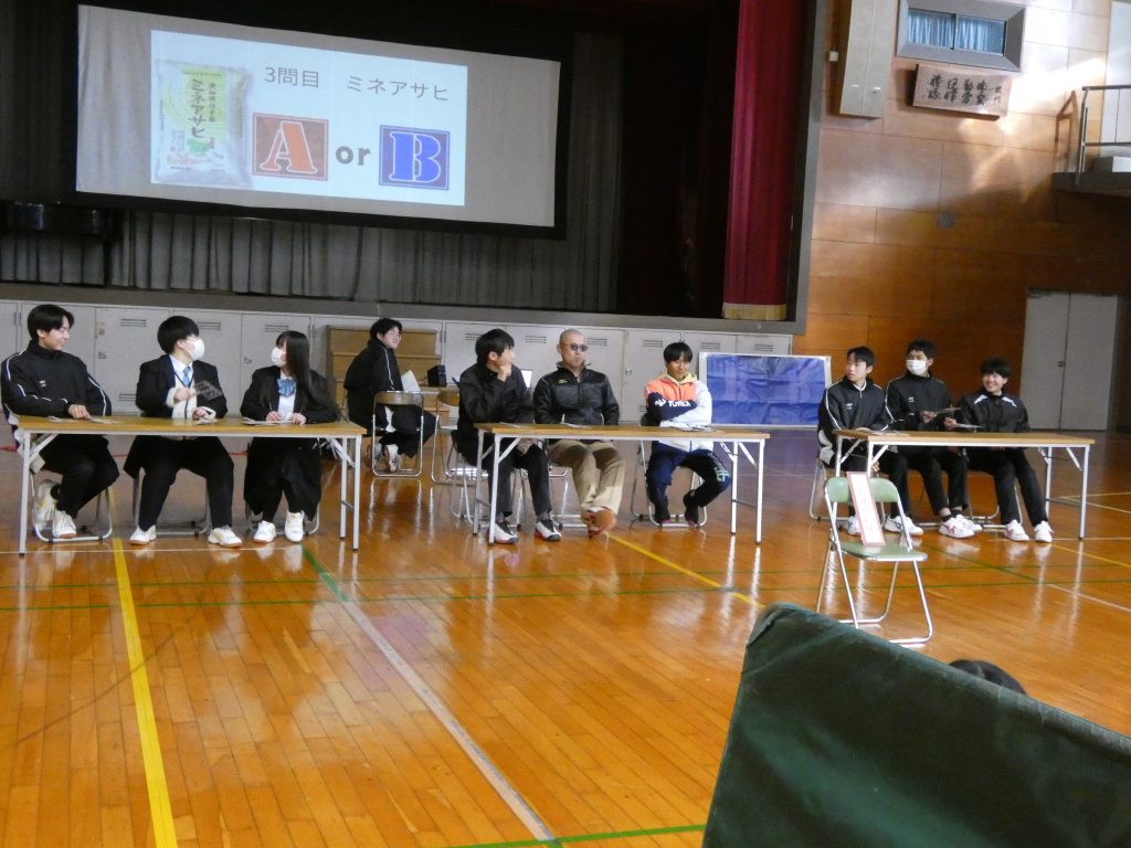 途中から教員チームも参加!3チームでしのぎを削り合いましたが、最終チェックの「ミネアサヒorコシヒカリ」の利きお米チェックで、なんと全チーム不正解!💦